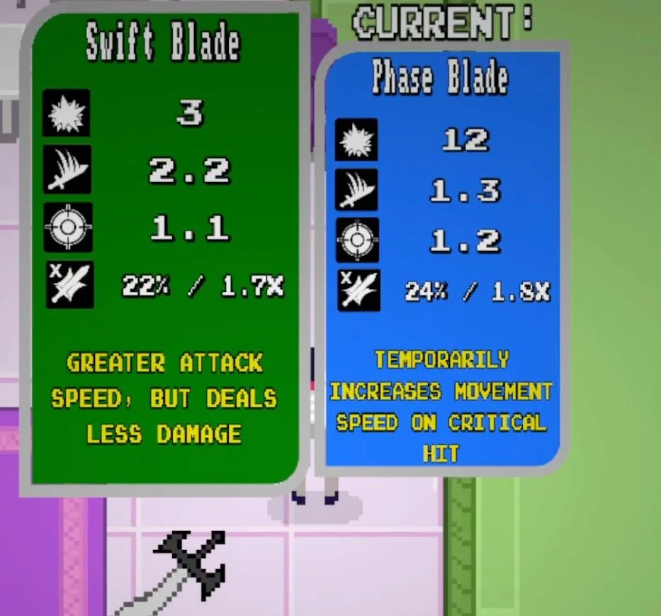 As the player could only hold one weapon at a time I wanted the player to be able to easily compare their current weapon with any new ones they find. When close enough to the weapon they can press a button to show the ground weapon’s stats, and next to it shows their current weapon’s stats.