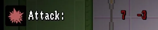 In this example, the Attack stat is by default 10. Here it shows the current Attack stat: 7, and the amount it has been modified: -3. The numbers are red to indicate to the player that this is negative change.