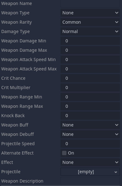 When creating the framework for the weapon system I added exposed variables to hold basic weapon information. This includes things such as weapon name, weapon type, and description, among other things.