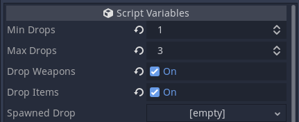 The chest object had exposed variables. These were minimum and maximum values that the RNG system would use to determine the number of loot drops to spawn. I added functionality that could be used to toggle on/off the chests ability to give the player weapons or items. This was in case we ever wanted have a chest that could only spawn weapons OR items for the player.